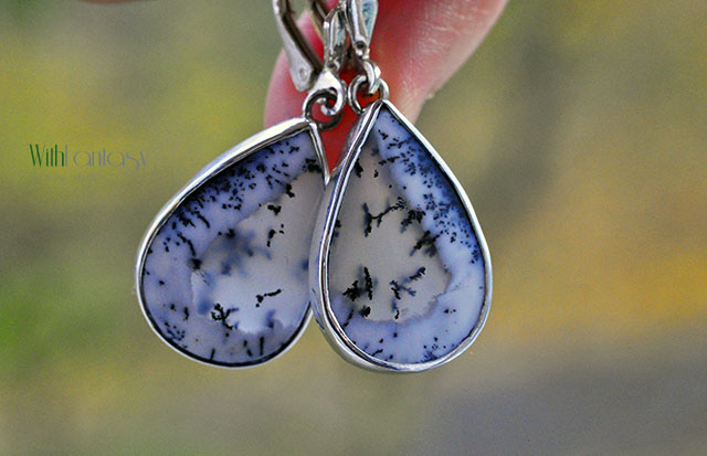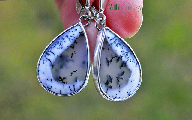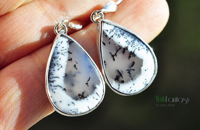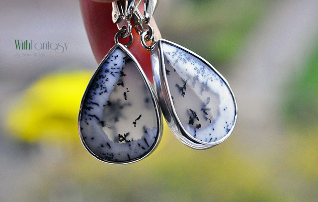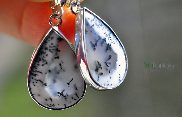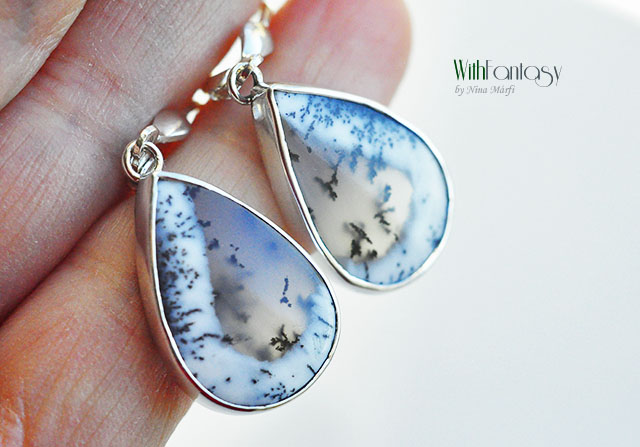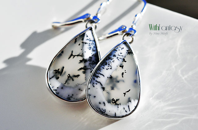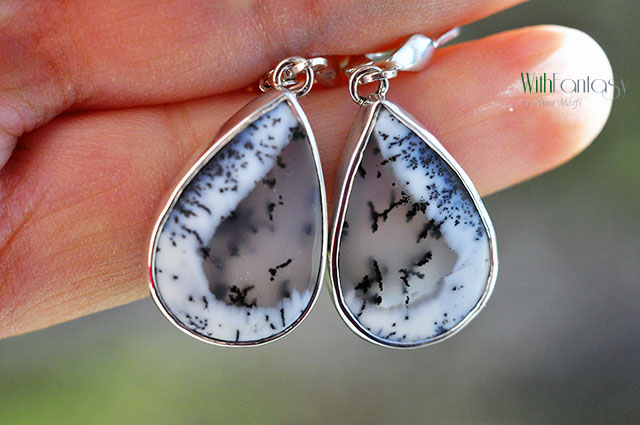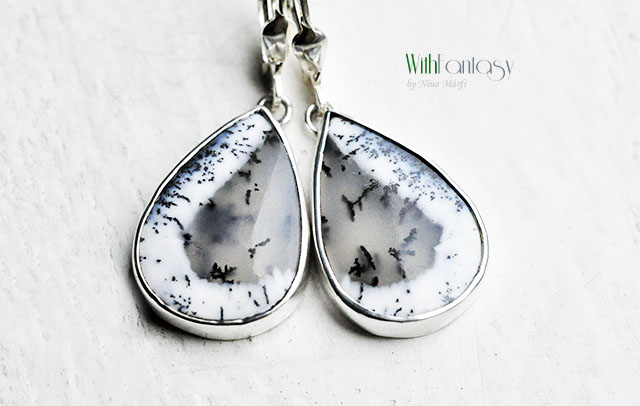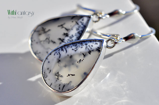 Minimalistyczna, niepowtarzalna para agatów dendrytowych oprawiona w srebro proby 925. Srebro białe, polerowane.