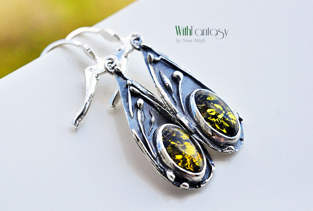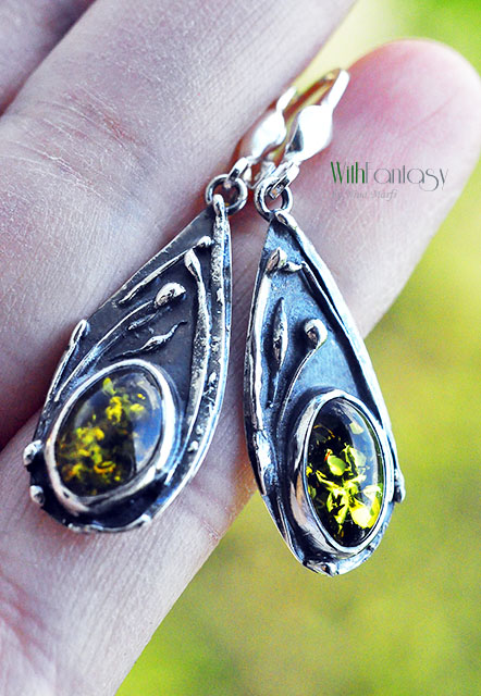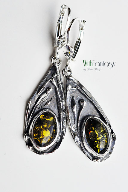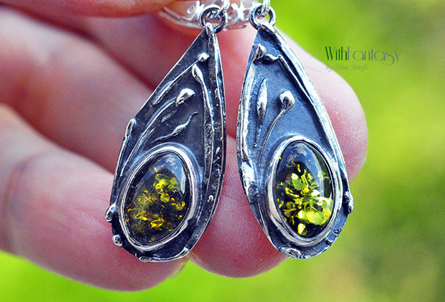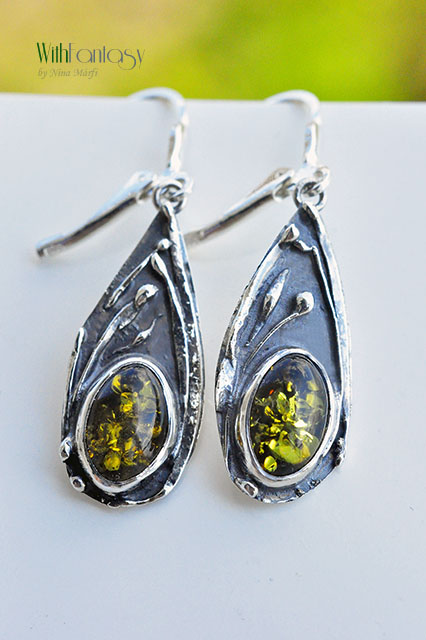 Leciutkie, bardzo wygodne kolczyki ze srebra próby 925 i zielonych bursztynów, wykonane w organicznym stylu.